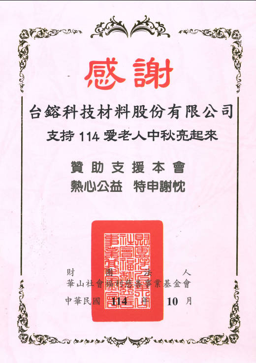 台鎔科技本著老吾老以及人之老的理念,特別於114年中秋佳節贊助華山基